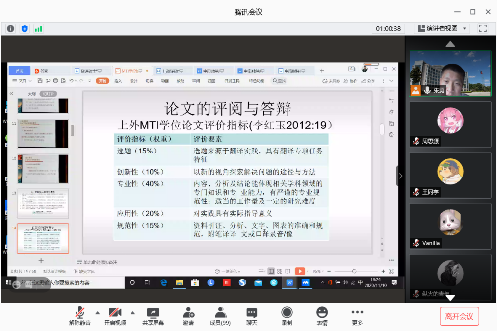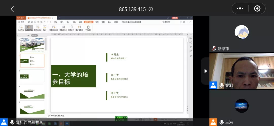 (通讯员 张冉 胡清华 魏炜)2020年12月15日晚7点,由我校研究生院、党委研究生工作部和校研究生会主办,外国语学院承办的“科学道德和学风建设宣讲教育”活动在腾讯会议成功举办。此次教育活动主要就前期举办过的研究生学位论文规范管理与学风建设教育大会、学术诚信学术沙龙活动以及学术诚信论文指导大会进行总结,并围绕“什么是科学道德与学风问题”、“科学道德与学风问题为什么会成为点”、“破解科学道德与学风建设问题的着力点在哪里”、“当代科技工作者应该坚持哪些规范”、“研究计划制定中的规范是什么”、“引文规范应注意哪些问题”这六个要点进行讨论分享。