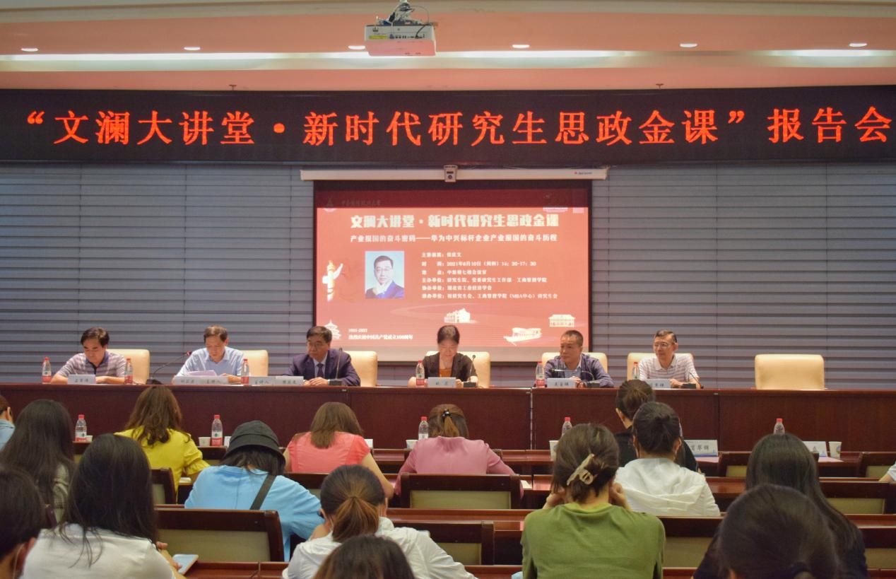 (通讯员 杨威 黄丽琼 余艺伟 陶涛 摄影 彭杨)为庆祝中国共产党成立100周年,回顾改革开放以来民族企业自主创新的奋斗历程,推进党史学习教育走深走实,6月10日下午,企事业单位管理专家侯庆文先生受邀作为主讲嘉宾,以“产业报国的奋斗密码——华为中兴标杆企业产业报国的奋斗历程”为主题为广大研究生讲授“文澜大讲堂•新时代研究生思政金课”,解读中国标杆企业、世界知名企业华为中兴的成功之道和管理经验,以民族企业居安思危的危机意识、务实奋进的创新精神激发师生爱党爱国情怀。校党委常委、副校长姚莉教授,杰出校友吴自祥先生,工商管理学院石军伟教授,党委研究生工作部肖翠祥部长出席报告会。研究生院、党委研究生工作部全体成员以及数百名学生到场聆听。报告会由研究生院院长胡立君教授主持。