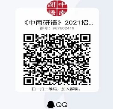 方式二:扫描下方“《中南研语》2021招新群”QQ群二维码,加入招新群,获取报名表(详见QQ群文件),将填写好的报名表发送至邮箱znyy2013@yeah.net。邮件标题名称统一设为“姓名+学院+申报版块+联系电话”。