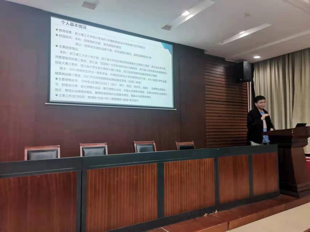 李国晨同学介绍了自己丰富的校园和实习经历。李同学是一个优秀的学生榜样,在金融学院就读期间曾多次获得全国性的重大奖项,并考取了CPA等众多资格证书。他以自己在多家会计师事务所和申万投行实习的经历,总结出了许多宝贵经验,并毫无保留地分享给了大家,参与活动人员均感到获益匪浅。