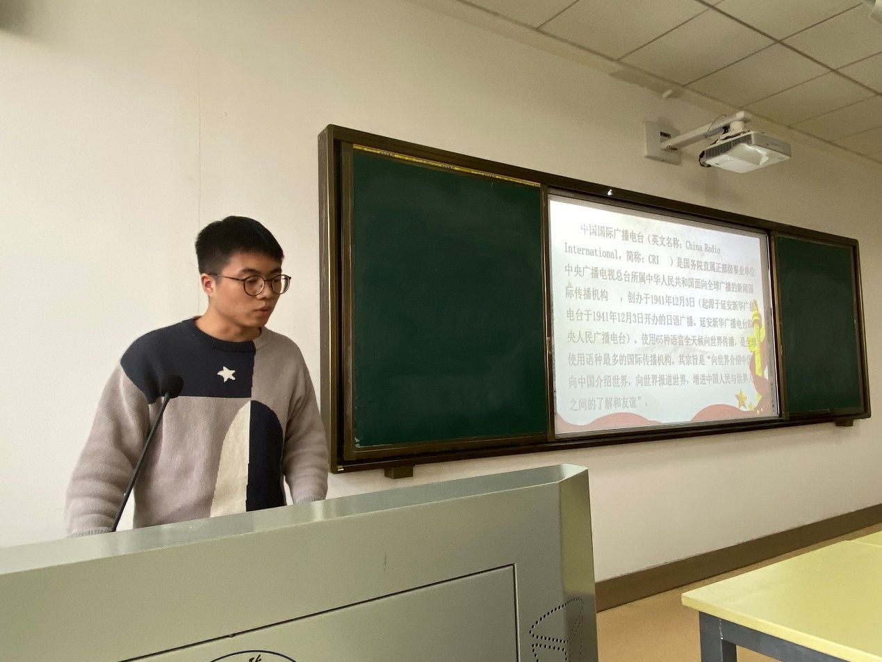外国语学院2020级研究生党支部成员邓泽锋以“党的对外宣传史——中国国际广播电台”为主题展开,介绍了中国国际广播电台从无到有、从小到大,逐步成为向世界介绍中国,向中国介绍世界,向世界报道世界,增进中国人民与世界人民之间了解和友谊的世界知名媒体之一的发展历程,激励大家扎实专业知识,化所学为所用,在新时代、新征程上奋力书写优异答卷。