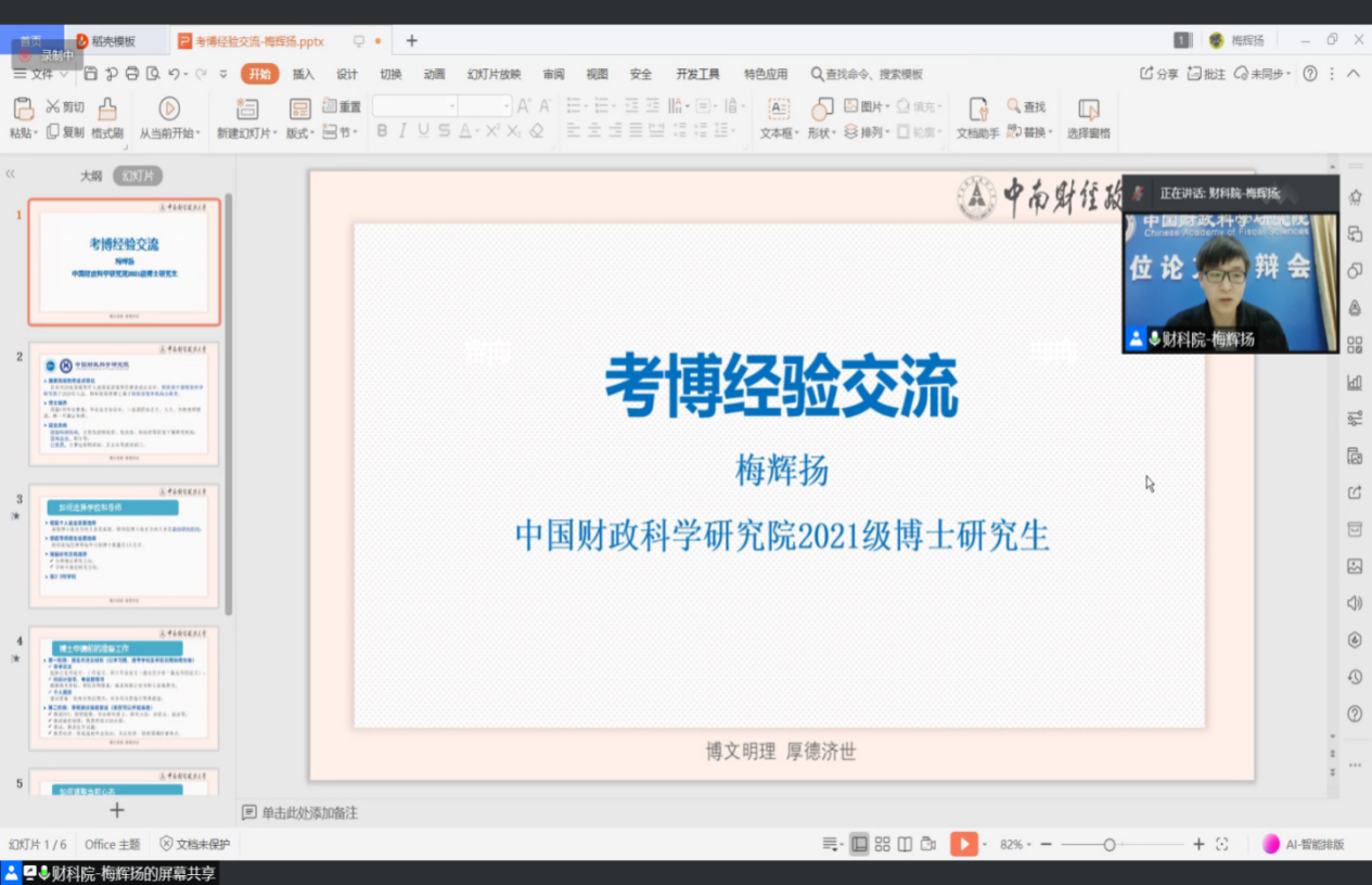 经验分享环节,三位博士研究生分别讲述了自己的备考规划并对博士申请过程中可能面临的问题提出了针对性建议。张静堃同学分享了上海财经大学的招生流程,并针对材料准备、笔试、面试、导师联系等问题给予建议;梅辉扬同学详细介绍了中国财政科学研究院的博士培养方案以及就业去向,并分享了申请博士前需要做的准备工作;刘锋同学主要分享了如何将攻读博士纳入自己的人生规划、如何培养自己的核心竞争力,并特别强调了学术功底和逻辑思维培养的重要性。