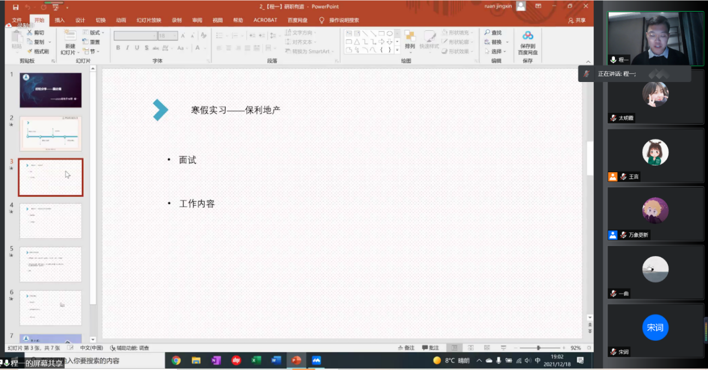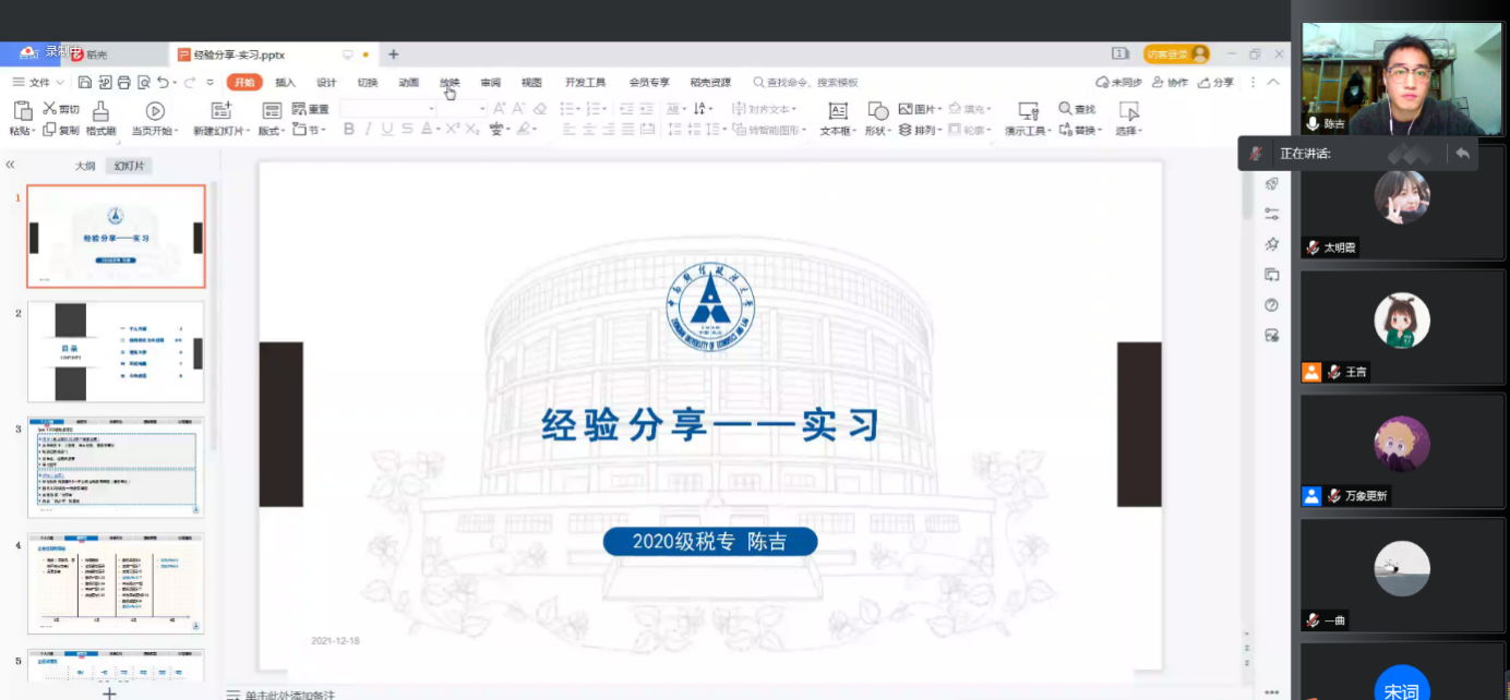 经验分享环节,三位嘉宾分别讲述了自己的实习经历和求职过程,并对其中可能出现的问题提出针对性建议。程一同学从寒暑假实习经历以及秋招国企面试的经历入手,阐述了对国企的看法;陈吉同学为我们详细介绍了求职的前期准备工作并强调了面试时心态建设的重要性;姚雨霏同学对事务所实习考核的主要流程做了详细的阐述,并根据自身经历为大家提供了可靠的建议。