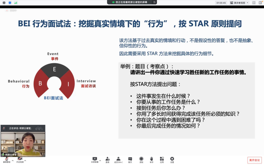 在应届生面试指导方面,谢莹老师从BEI面试方法引入,介绍了企业普遍运用的面试工具,丰富了同学们对企业考察过程的认知。随后,她分结构探讨了面试过程中的常见问题,逐一进行深入剖析并提供应对建议。最后,谢老师深入介绍了面试前的必要准备与面试过程中的贴切表达,针对面试环节进行要点提炼,为同学们未来的面试表现打下了牢固的基础。