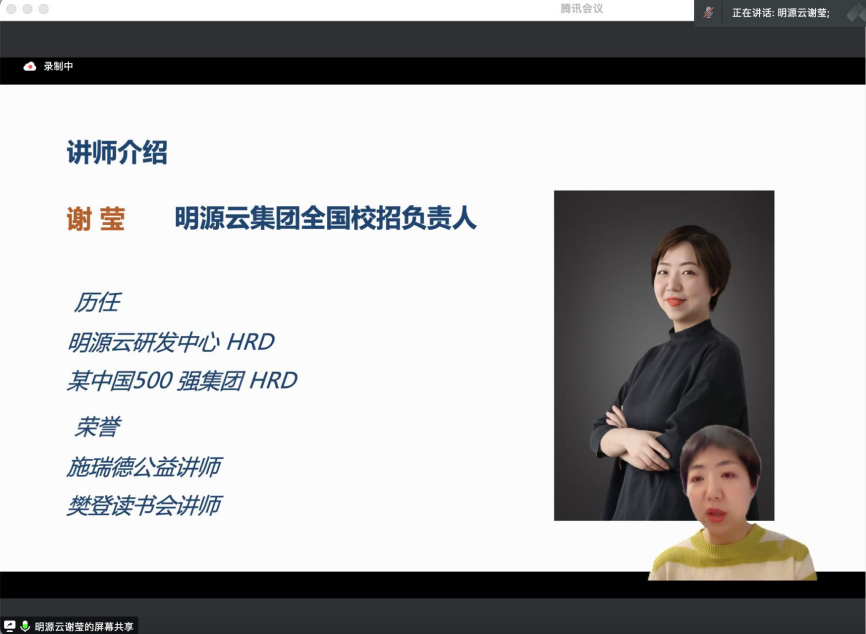 本次讲座邀请明源云全国校招总监谢莹担任主讲嘉宾,谢莹老师具有10年上市企业HRD工作经验,拥有“学道家塾”全国企业大学校长联合会成员、施瑞德讲师、公益讲师团成员和樊登读书会促动师身份,其招聘项目曾入围2012年度“HR智享会”招聘创新实践案例。