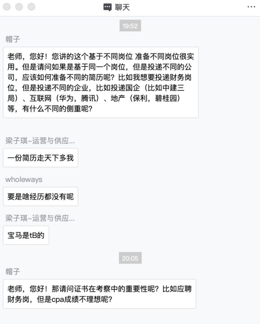 结束分享后,谢莹老师与同学们进行了互动交流,同学们就如何针对不同公司准备简历以及证书在考察过程中的重要性进行请教。谢莹老师认为,有针对性的简历准备更能够凸显求职者对企业的重视,建议同学可以先深度了解企业岗位的相关招聘需求以及未来培养规划,然后再有针对性地准备个人简历。同时,具有含金量的证书是加分亮点,简历内容需要突出这部分优势。