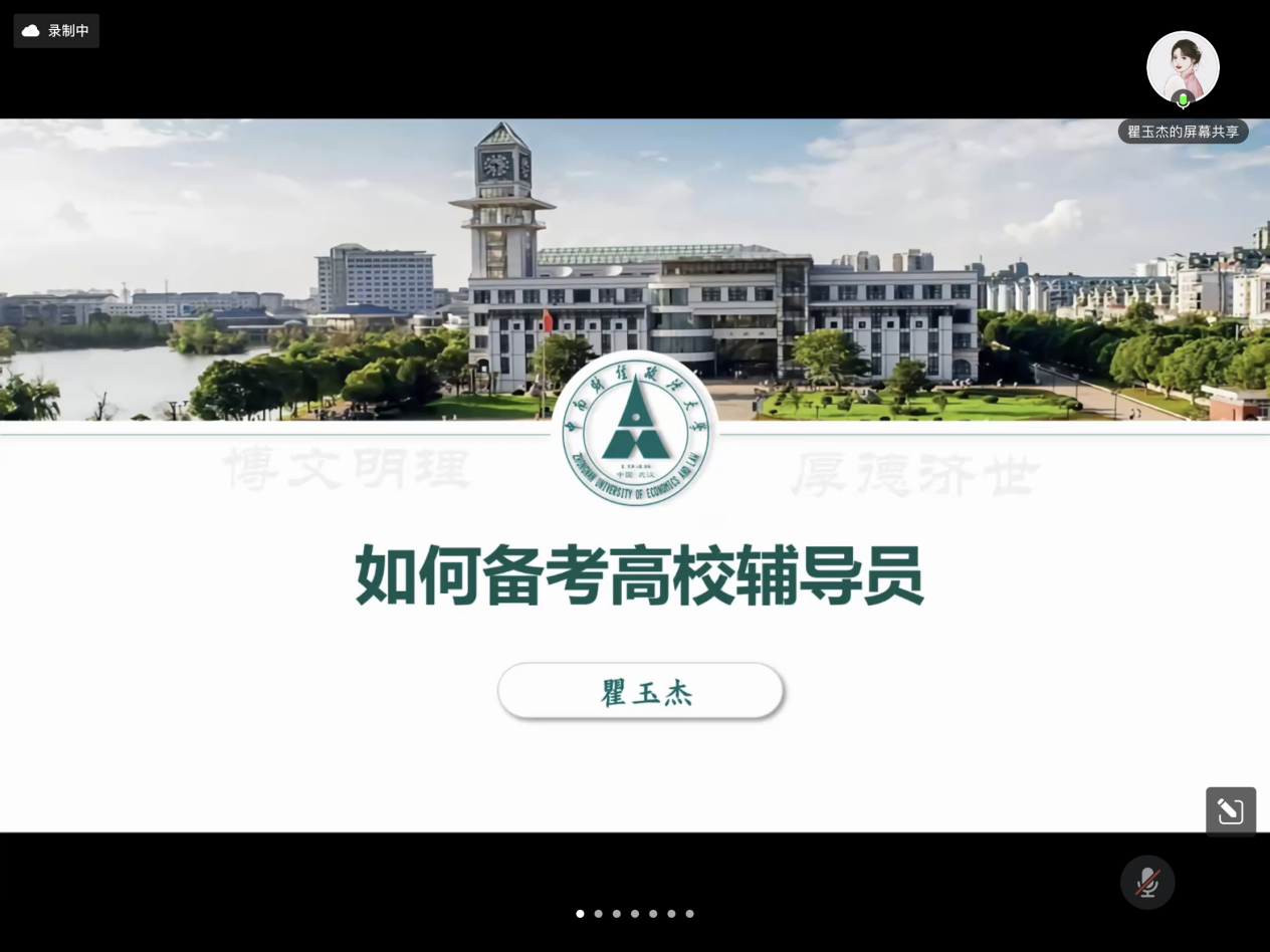 工商管理学院2019级研究生瞿玉杰同学,现拟被本校录用为专职辅导员,她从备考辅导员的原因和条件、准备时间、笔试面试、信息来源等多个方面向同学们分享了求职心得。她谈到,要做好辅导员考试的准备工作,关注意向学校官网信息和思政公众号等信息渠道,笔试要多总结多背诵,如辅导员考试主观题、时事热点等,面试时要注意个人仪态,备考时多进行模拟面试练习,做到有备无患。