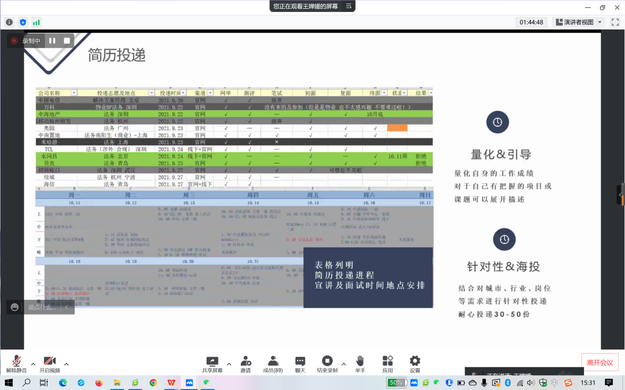 法律硕士教育中心2019级研究生王婵媛同学,现签约于中海地产。她结合个人就业经历从实习、简历投递、面试准备等方面大家提供了求职指导。王婵媛同学谈到,为了平衡就业和学习,毕业论文的写作一定要趁早准备,多借助excel等工具厘清“行业、岗位、城市、薪资”等指标的重要度以及多岗位投递时的节点跟进问题,多复盘,总结经验,做好整体职业规划。