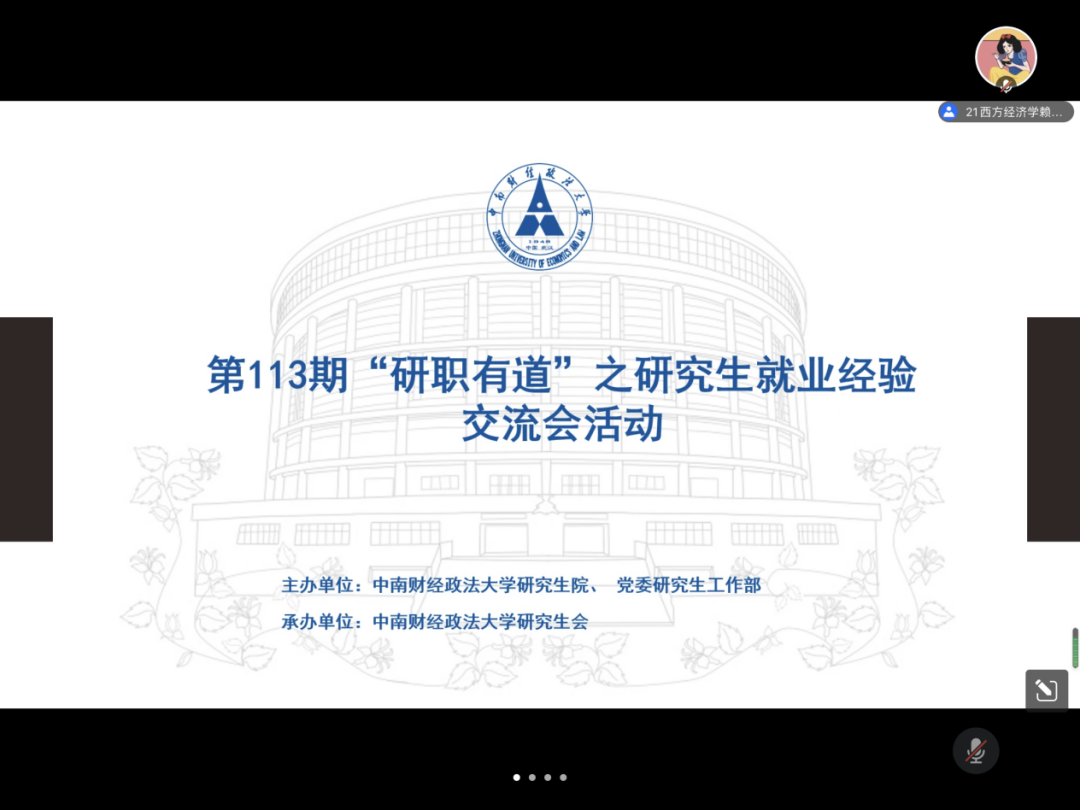 (通讯员 薛萍 孙嘉徽)为引导广大研究生应对就业形势变化,掌握求职技巧,提高核心竞争力,实现更高质量、更加充分的就业,由研究生院、党委研究生工作部主办,校研究生会承办的第113期“研职有道”之研究生就业经验交流会于6月12日下午成功举办。本次交流会以腾讯会议的方式进行,邀请了高园、李锡青、瞿玉杰、王婵媛和韩思淼五位优秀研究生代表作为主讲人,分享自身升学和求职经验。本次就业经验交流会由校研究生会生活权益部成员赖艳萍主持。