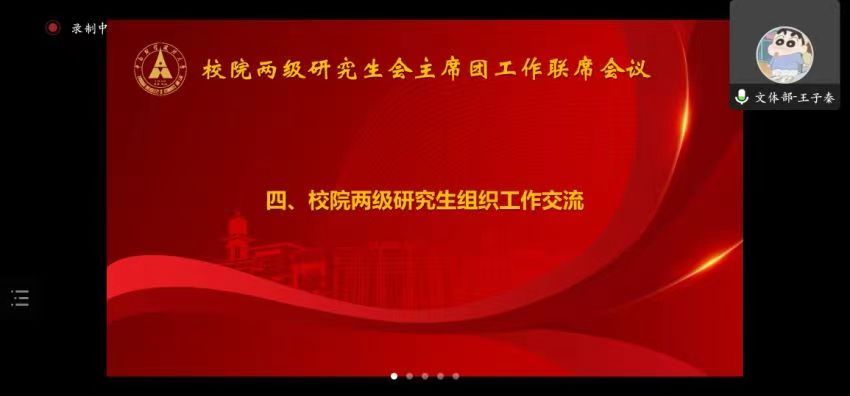 (通讯员 韦晨依 吴润泽 摄影 王雨婷)为深入学习宣传贯彻党的二十大精神,全面贯彻习近平总书记关于青年工作的重要思想和关于教育的重要论述,切实加强校院两级研究生会的交流联系,10月30日18:30,校院两级研究生会联席会议以线上方式举行。校研究生会主席团成员、各部门负责人、各学院(中心)研究生会主席团成员代表参加会议。会议由第三十八届校研究生会执行主席温晖蕾主持。