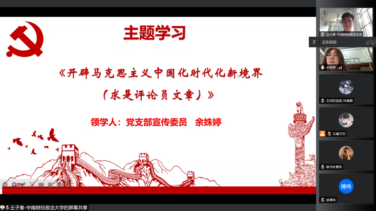 (通讯员 孙嘉徽 王子秦 摄影 余姝婷)为全面学习贯彻党的二十大精神,明确党和国家未来发展的目标方向和战略安排,加强党支部的组织建设,夯实党的阵地堡垒,增强党支部引领力、组织力、服务力和大局贡献度,10月30日,校研究生会党支部开展了以“自信自强新时代,踔厉奋发新征程——深入学习宣传贯彻党的二十大精神”为主题的10月支部主题党日活动,本次会议以线上形式开展,校研究生会党支部全体成员参加会议,校研究生党员理论宣讲团成员赵丽莹,新闻与文化传播学院网法2101班团支部书记胡馨予作为特邀嘉宾共同参加会议。会议由校研究生会党支部书记王子秦同志主持。