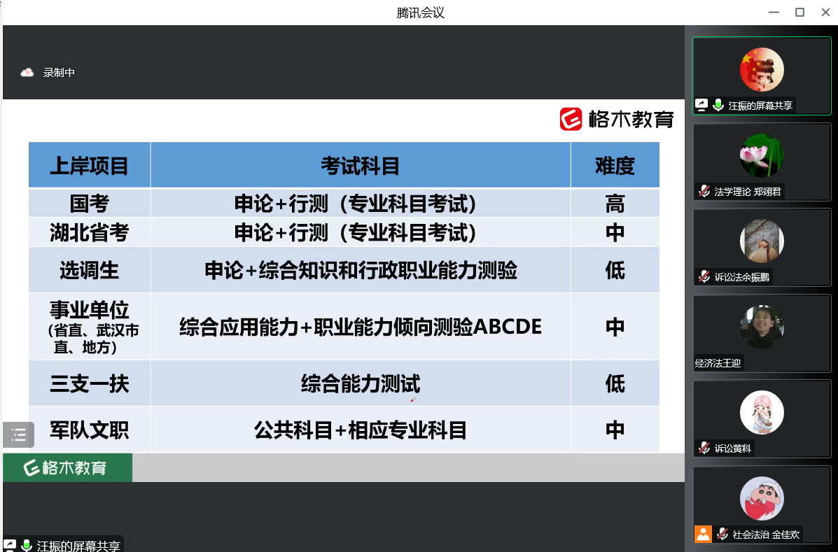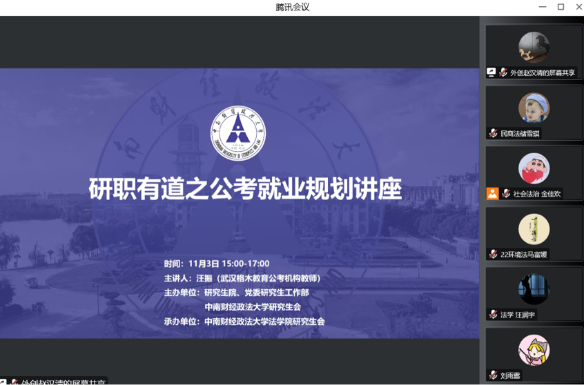 (通讯员 张秋蕊 郑翊君 储雪琪)为提升我校研究生对公考就业的认识,明确就业规划与目标,11月3日下午,由研究生院、党委研究生工作部主办、法学院研究生会承办的第120期“研职有道之初识职场”公考就业规划(线上)讲座成功举办。本次讲座的主讲嘉宾为格木教育的汪振老师,法学院研究生会指导老师张秋蕊老师出席本次讲座。讲座由法学院研究生会成员黄科主持。