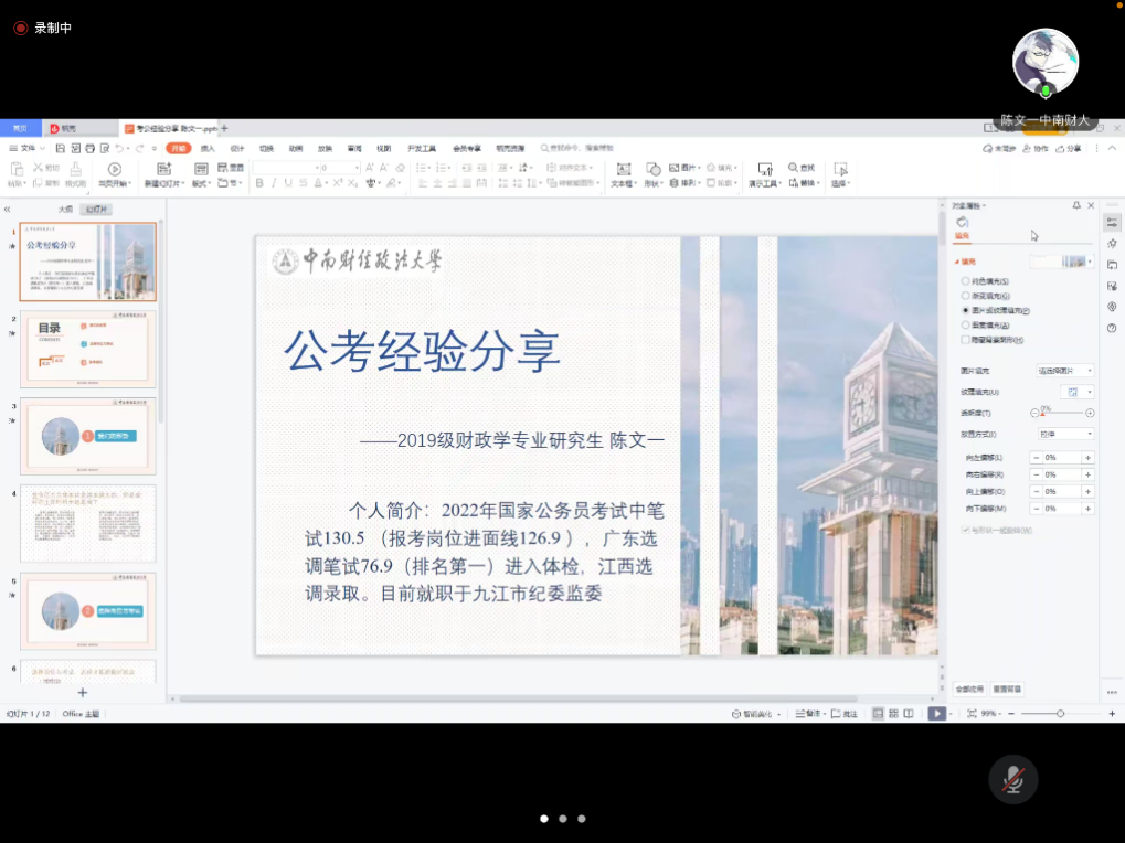 本次活动分为经验分享和互动交流两个环节。在经验分享环节,就职于江西省委组织部的陈文一分别从公务员考试形势、岗位选择、备考建议三个角度展开介绍了他的备考经验。