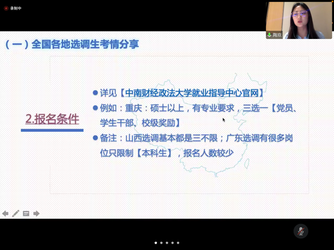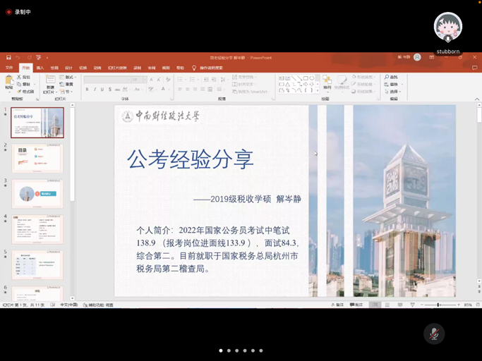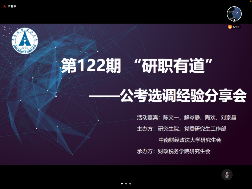 (通讯员 程明梅 张伟庆)为帮助我校研究生明确就业目标,树立正确择业观,提升就业能力,11月12日晚,由研究生院、党委研究生工作部、校研究生会主办,财政税务学院研究生会承办的第122期“研职有道之对话职场”公考选调经验分享会于线上成功举行。本次活动邀请了2019级财政学学硕陶欢、2019级税收学学硕解岑静、2019级财政学学硕陈文一、2020级税务专硕刘京晶进行选调公考经验分享。分享会由财政税务学院研究生会成员张伟庆主持,全院研究生参会。