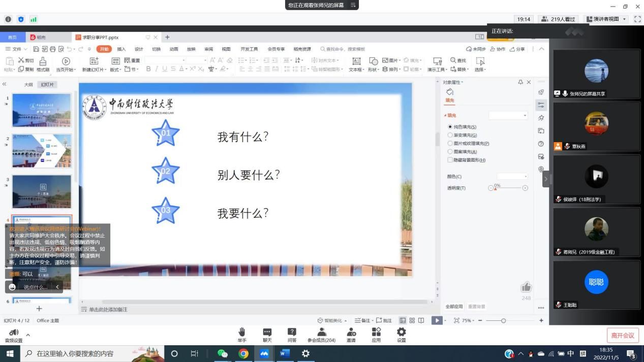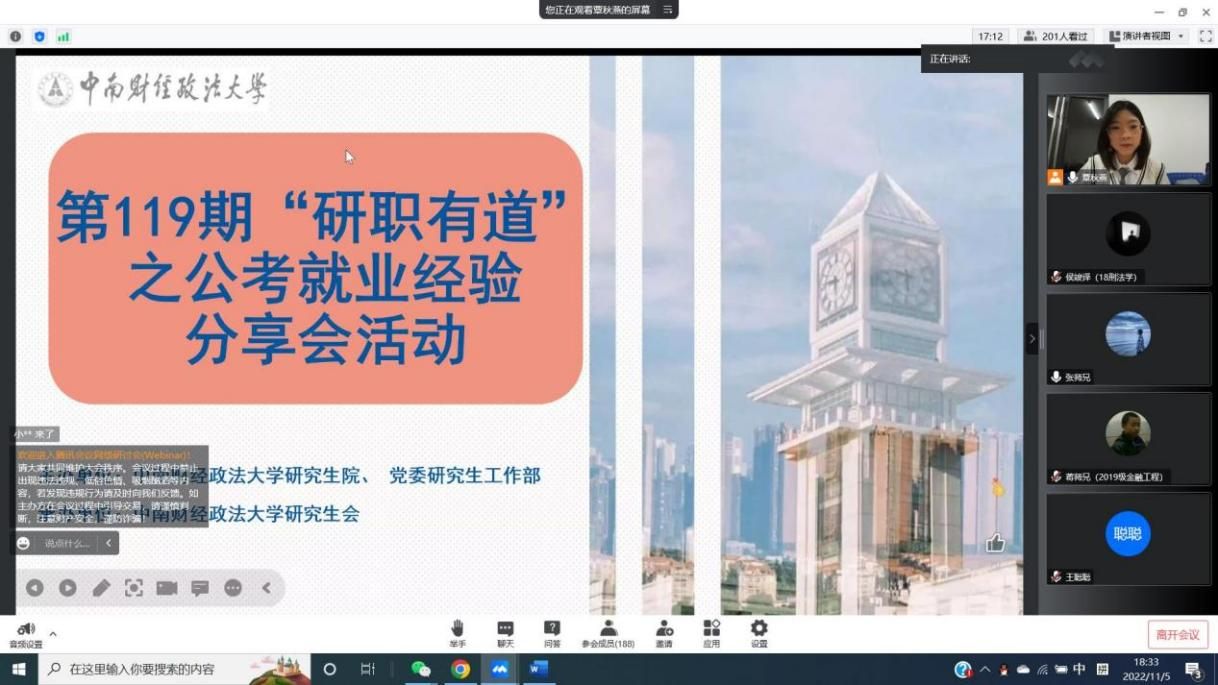 (通讯员 孙志鹏 田书萌)为学习宣传贯彻党的二十大精神,积极响应就业优先战略,促进高质量充分就业,进一步帮助我校研究生树立正确就业观,提前做好职业生涯规划,11月5日晚,由研究生院、党委研究生工作部主办,校研究生会承办的第119期“研职有道”之公考就业经验分享会成功举行。分享会以线上方式举办,邀请了我校5位优秀研究生毕业生分享公务员备考求职就业经验,共计300余名研究生线上参会。分享会由校研究生会生活权益部成员覃秋燕主持。