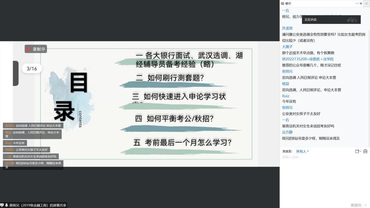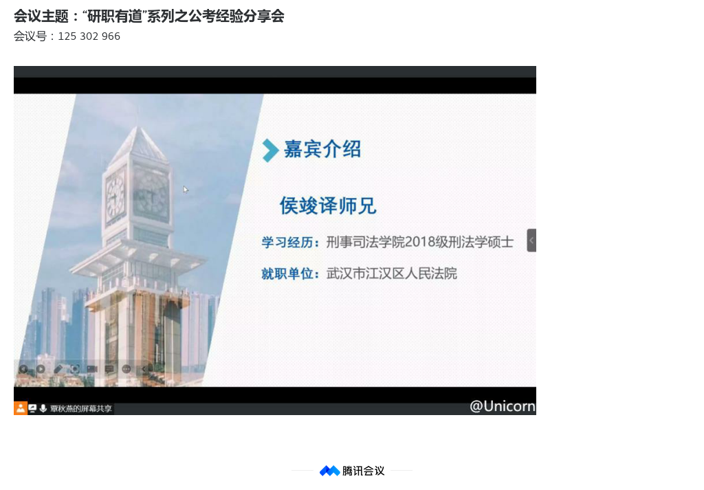 就职于武汉市江汉区人民法院的2018级刑法学硕士侯竣译从基层法院的实际情况、报考公务员建议和复习经验三个方面进行了经验分享。