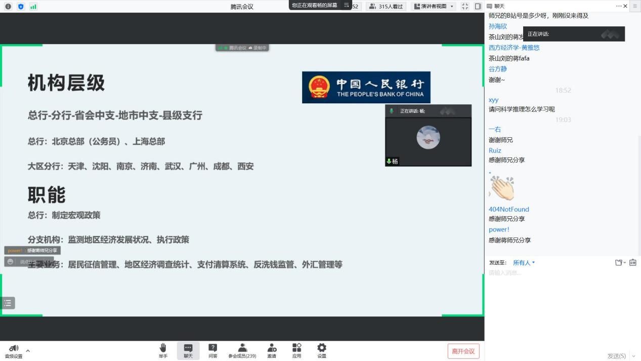 就职于中国人民银行广州分行的2019级金融学专业硕士杨思睿从人民银行概况、考情分享、经验总结三个方面进行了分享,重点解答了待遇、晋升、工作强度等同学们关心的问题。