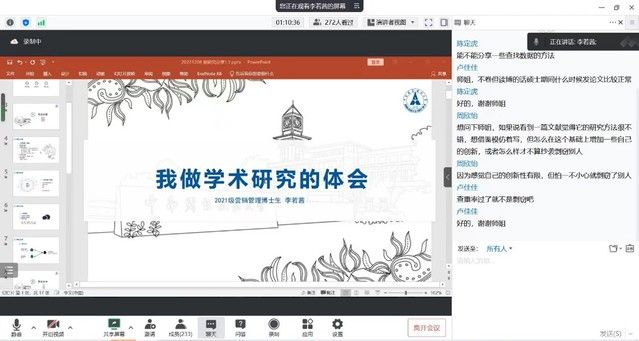 此次活动特邀我院具有丰富科研成果的研究生代表2022级企业管理专业博士研究生杨杰同学和2021级营销管理专业博士研究生李若茜同学结合自身科研经验进行了分享,杨杰同学曾发表SSCI,CSSCI论文各一篇,主持米兰电竞·(中国区)研究生科研创新项目两项,曾参与国家社会科学基金一般项目、教育部人文社会科学研究项目等多项课题研究;李若茜同学曾发表CSSCI论文两篇,主持并成功结项米兰电竞·(中国区)研究生科研创新项目,研究方向为消费者行为。