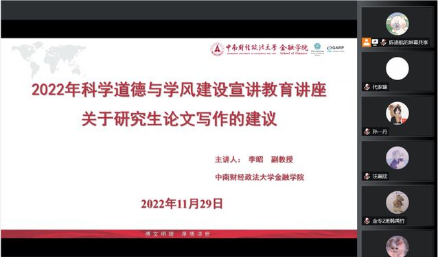 (通讯员:徐一菱、胡仁林、王晨月)为全面学习宣传贯彻党的二十大精神,深刻领会习近平总书记关于科学道德和学风建设重要指示精神,切实提升研究生教育支撑引领经济社会发展能力,更好地帮助同学们树立正确的科学道德和学风的建设,从思想上形成对于科学道德的学风的正确认识。2022年12月8日19:00-20:30,由我校研究生院、党委研究生工作部和校研究生会主办,工商管理学院(中心)承办的“科学道德和学风建设宣讲教育”通过腾讯会议在线上成功举办。