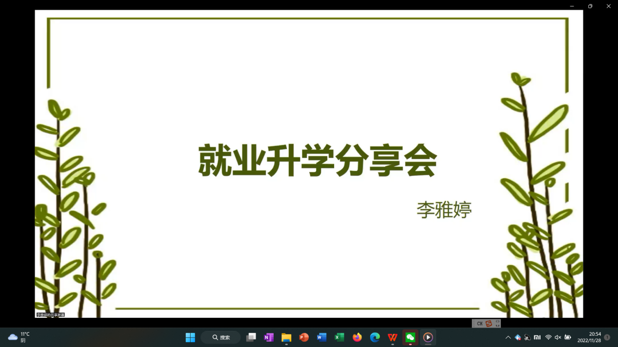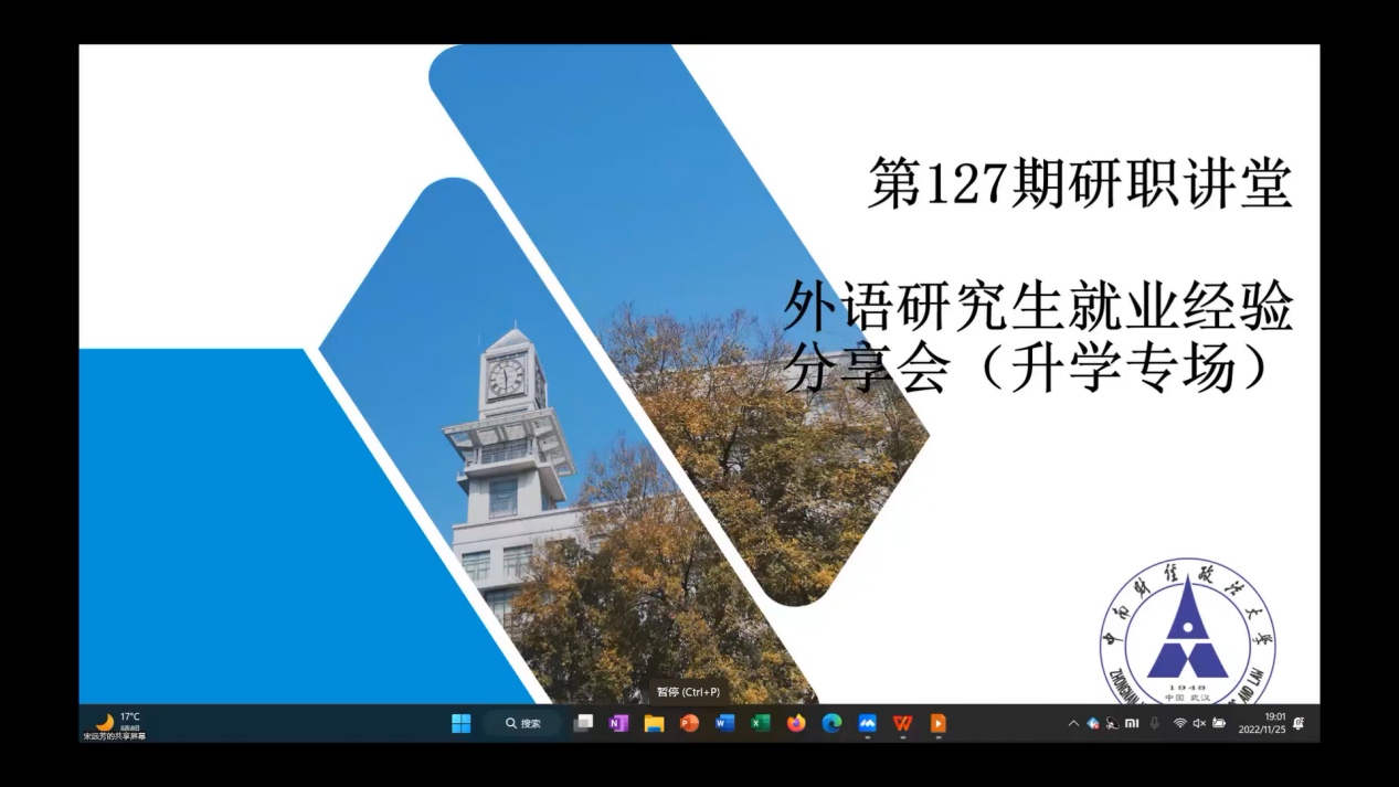 (通讯员 张冉 黄嘉利)为引导我院研究生充分了解升学形势,科学合理规划未来, 2022年11月25日晚,由研究生院、党委研究生工作部、校研究生会主办,外国语学院研究生会承办的第127期“研职有道之初识职场”——外语类研究生升学经验分享会成功举办。分享会以线上形式举办,特别邀请了2019级日语语言文学硕士生毕业生王港、2020级通用笔译硕士毕业生李雅婷进行升学经验分享,学院全体硕士研究生参会。分享会由外国语学院研究生会生活部负责人宋远芳主持。