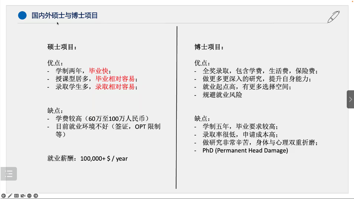 齐聪为同学们介绍了国内外硕士与博士项目的内容与申请流程,对比分析了国内外硕士与博士项目的优缺点,并建议同学们结合自身情况做合理的选择。