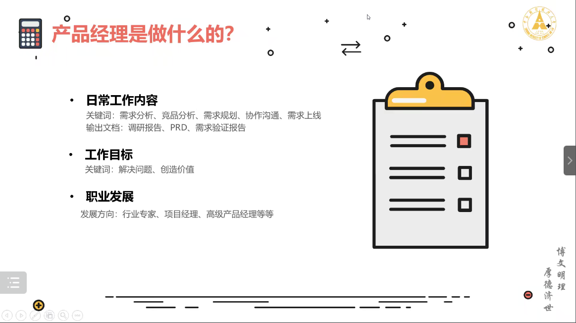 张嘉妮详细介绍了产品经理的日常工作内容、工作目标和未来职业发展方向。她向大家提供了实习和就业时间规划表,建议同学们尽早做好就业规划,并为大家详细讲解了面试技巧和注意事项。