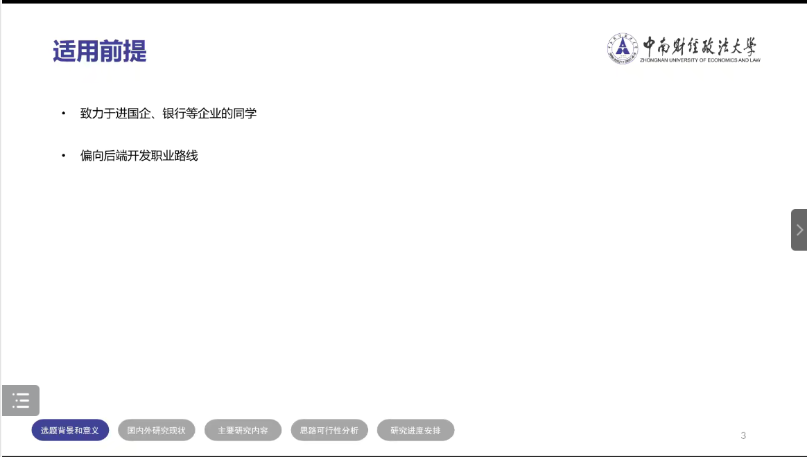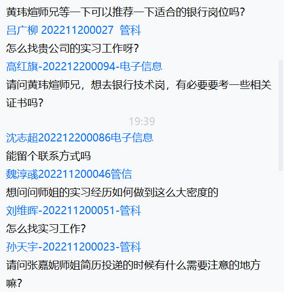 黄玮煊为同学们分享了国企、银行中后端开发岗位的实习与求职经验。他以自身实习经历为例,向大家介绍了部分国企、银行的薪资和招聘情况,为同学们未来择业提供了多个方向的选择。