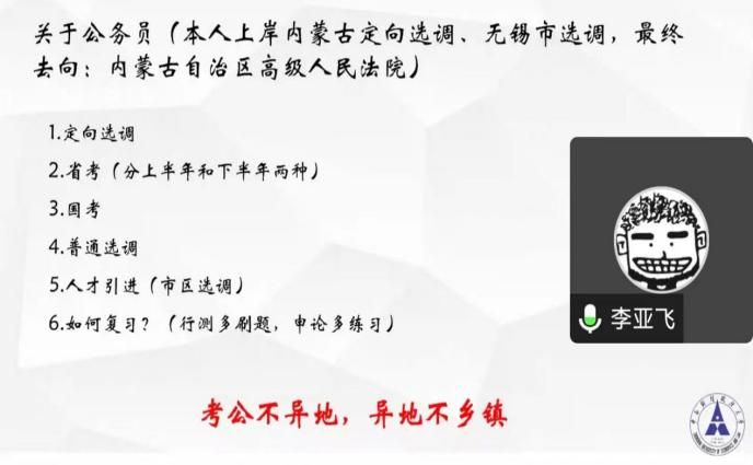活动伊始,陈乾根据自身的就业经验为大家分享如何选择就业方向以及如何准备公务员考试。在就业选择方面,他建议同学们提前去律所、检察院、法院等地方实习,并根据就业目标确定自己研究生期间的规划;在公考准备方面,陈乾从选调生备考原则、公考复习时间规划、岗位选择等方面进行了分享,并向同学们推荐了学习平台。