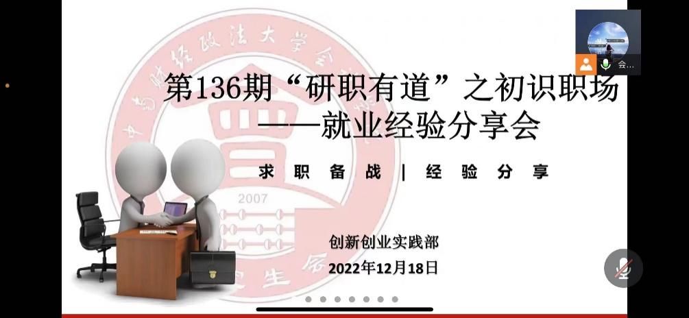 (通讯员 杭慧喆 常佳颖)为帮助我校研究生了解就业形势,掌握更全面的求职技巧,实现更多元的发展和更高质量的就业,12月18日晚,由研究生院、党委研究生工作部、校研究生会主办,会计学院研究生会承办的第136期“研职有道之初识职场”——就业经验分享会于线上成功举办。本次活动邀请了连仕祺、张惠鑫、刘煜千三