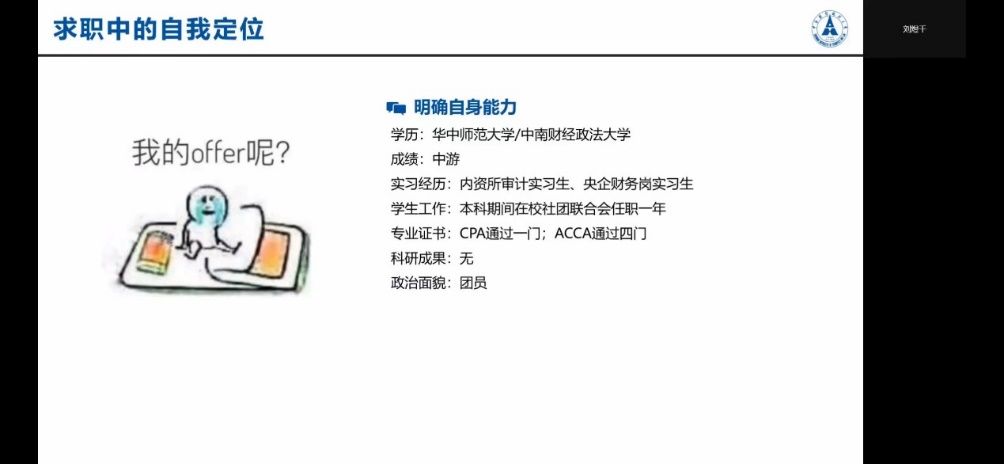刘煜千从自我定位、信息搜集和求职经验分享三个部分具体地讲解了秋招中成功的秘诀,并为大家介绍了国企、事业单位招聘信息的获取渠道。