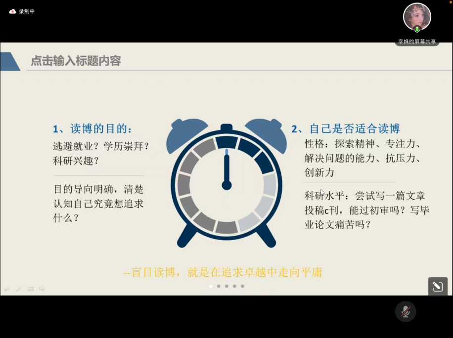 讲座伊始,李姝从是否选择读博、博士申请方式、申请-考核制流程以及如何提高成功概率四个方面展开讲解。李姝指出,同学们应首先明确读博目的,并结合性格特质和科研水平理性判断自身是否适合读博;其次,有志于申博的同学要打好“信息战”,充分了解申请-考核制等博士考核方式,掌握各学校招生信息;最后,她建议同学们在硕士期间应努力夯实理论基础,提升科研实力,积累科研成果。