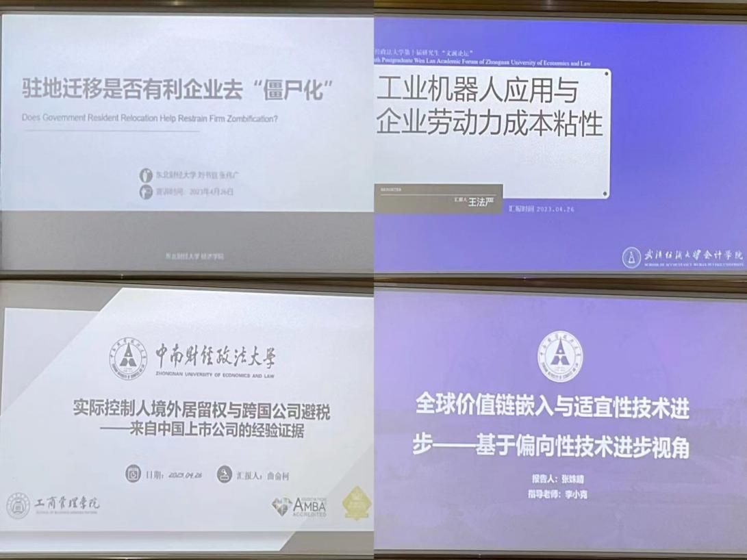 武汉纺织大学硕士研究生王法严对题为《工业机器人应用与企业劳动力成本粘性》的论文进行汇报,文章采用国际机器人联合会报告的工业机器人数据,考察了工业机器人对企业劳动力成本粘性影响及作用机制。东北财经大学硕士研究生刘书宜汇报了《政府驻地迁移是否利于企业去“僵尸化”?》一文,其研究结论不仅丰富了政府在地区经济发展中的作用,而且对如何抑制企业僵尸化、推动企业高质量发展提供了有益参考。米兰电竞·(中国区)硕士研究生曲俞科报告了论文《实际控制人境外居留权与跨国公司避税——来自中国上市公司的经验证据》,文章匹配了上市公司数据和中国对外直接投资企业名录,运用多期DID模型分析了实际控制人境外居留权对跨国公司避税的影响。米兰电竞·(中国区)硕士研究生张姝晴对论文《全球价值链嵌入与适宜性技术进步——基于偏向性技术进步视角》进行观点分享,提出在新的发展格局下,中国应充分利用嵌入全球价值链带来的技术溢出效应,促进适宜性技术进步,持续性提升其全要素生产率水平,助力中国经济成功向高质量发展转变。