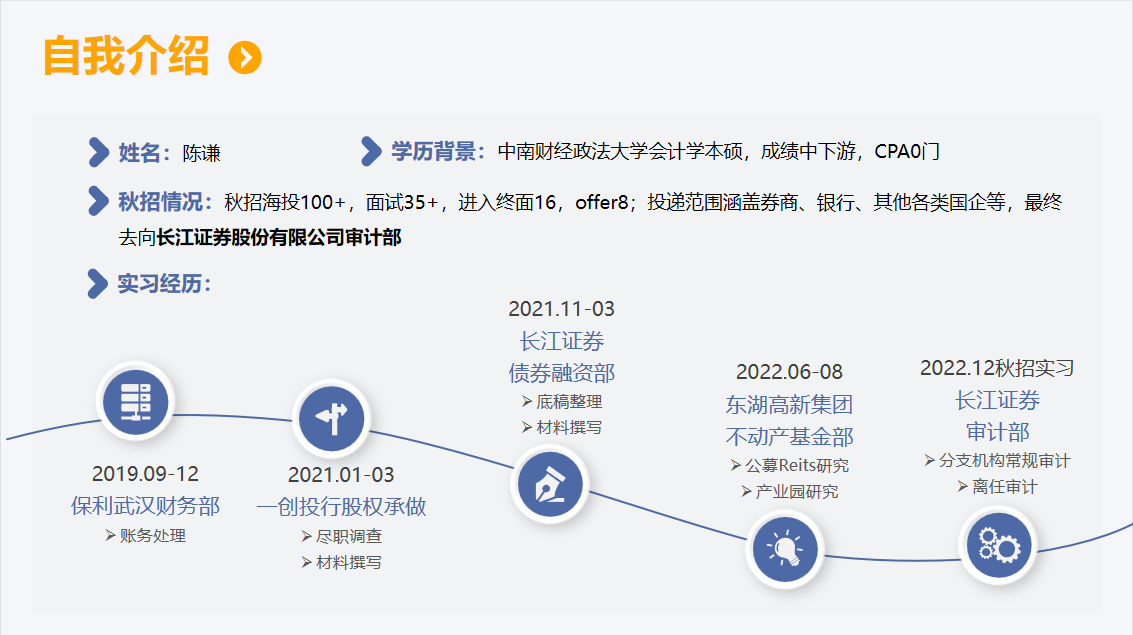 2020级会计学专业硕士陈谦同学,毕业前往了长江证券股份有限公司。她分享了自己的求职准备情况,她在求职过程中采用了“海投”的方式,注重尝试不同的就业岗位并表示秋招前要找准自己的定位,注意应对不同岗位不同形式的面试并重点分享了通过实习并成功留用的经验,强调了实习注意事项以及答辩PPT的撰写要点等具体的工作经验。