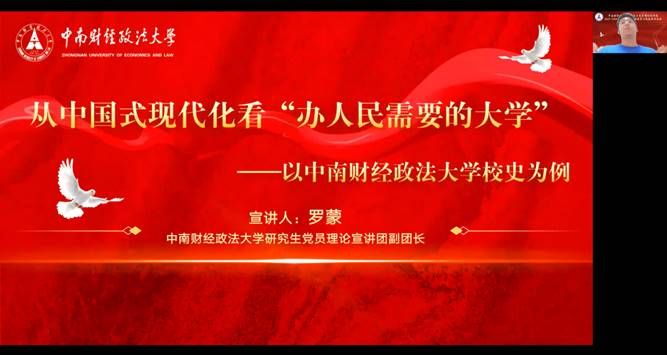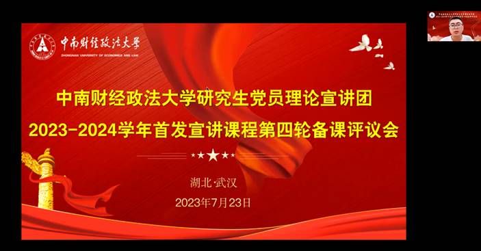 (通讯员 姚智妮 彭佩凡 摄影 万雯)为全面学习宣传贯彻习近平新时代中国特色社会主义思想及党的二十大精神,深入推进学习贯彻习近平新时代中国特色社会主义思想主题教育走深走实,推动各高校宣讲团交流互鉴,加强朋辈交流学习,进一步提升我校研究生党员理论宣讲团(以下简称“宣讲团”)主题宣讲质量和水平,7月23日晚上20:00,在党委研究生工作部指导下,宣讲团开展了2023年度首发宣讲课程第四轮线上备课评议会。评议会特邀中国农业大学、北京师范大学、上海对外经贸大学、浙江大学、郑州大学、西南交通大学、青海大学共7所兄弟高校的宣讲团代表作为朋辈评议人受邀出席。会议由宣讲团组织部部长汪星宇同志主持。