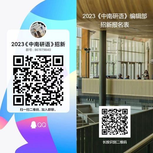 请报名的同学扫描下方QQ群二维码加入2023《中南研语》招新群,招新相关事宜将在群内发布。