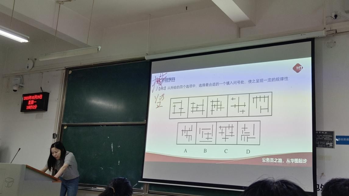 在备考技巧上,李老师从历年考试真题入手,详细说明了不同考题类型的分数占比,并结合幻灯片中列举的图形推理、语言理解等不同类型的考题与同学们进行互动。