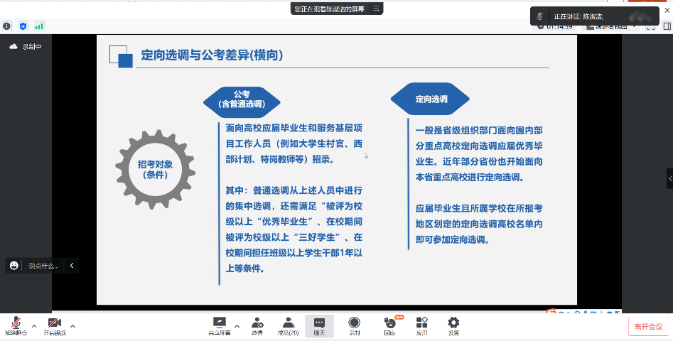 陈淑洁结合个人经历,介绍了定向选调招录情况及其与普通公考的差异、定向选调备考的流程和技巧、在校期间需要着重培养的能力等,并分享了自己的工作感悟。