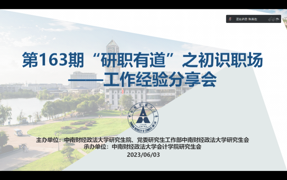 (通讯员 杭慧喆 黄文婕)为帮助同学们在秋招前对未来工作趋势和内容有进一步了解,掌握科学求职规划方法,高效提升就业竞争力,6月3日晚,由研究生院、党委研究生工作部、校研究生会主办,会计学院研究生会承办的第163期“研职有道之初识职场”——券商+选调生工作经验分享会于线上成功举办。本次活动邀请了会计学院2019级审计硕士研究生陈淑洁和会计学院2020级审计硕士研究生黄俊德作为嘉宾分享工作经验。活动由会计学院研究生会成员尹灿欣主持,全院研究生和本科生参与。
