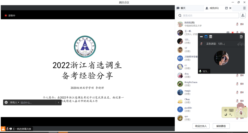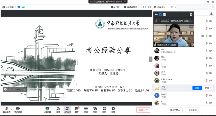 (通讯员 刘秋霞)为加强我校研究生的就业竞争力、提升研究生们对就业情况的了解、帮助研究生们掌握考公技巧,10月27日晚,由党委研究生工作部、校研究生会主办,财政税务学院研究生会承办的第173期“研职有道之初识职场”——考公经验分享会在腾讯会议线上召开。本次活动邀请了深圳罗湖税务局廖铭珍师姐、嘉兴市委组织部李晓妍师姐、襄阳税务局王娅婷师姐进行考公经验分享。