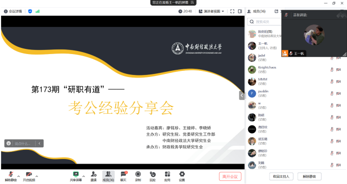 至此,第173期“研职有道之初识职场”——考公经验分享会圆满结束。本次经验分享会有助于同学们更深入地了解了公务员考试,学习了许多备考方面的经验有助于研究生们在未来公务员考试有更加出色的表现。