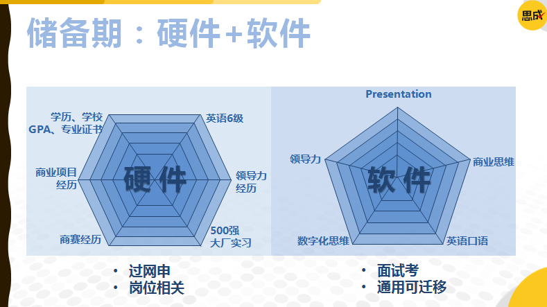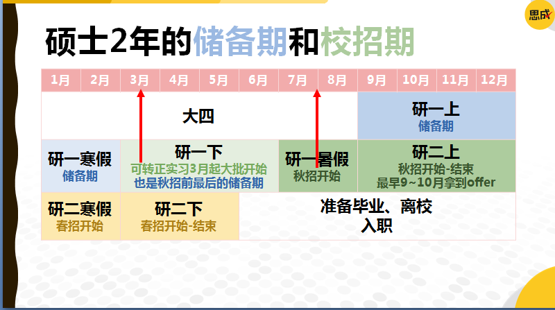 孔老师针对不同学制的研究生给出了储备期的提升时间轴参考,分为硬件储备和应聘技能提升两个大的阶段。建议同学们在校期间多参加名企的项目和商赛,在寒暑假多参加实习。