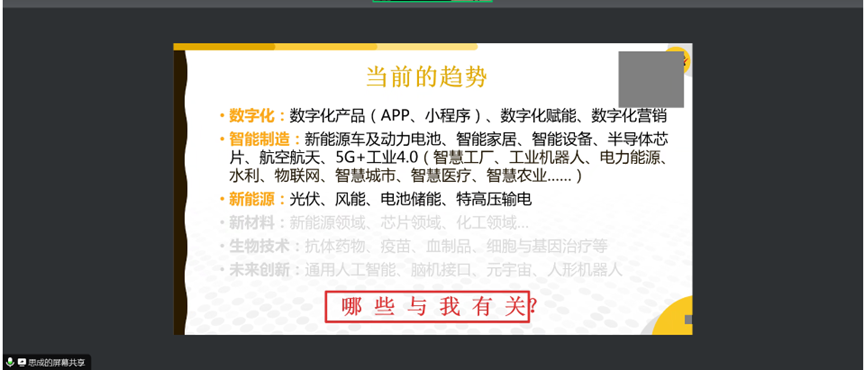 孔翔老师首先介绍了目前国内经济形势和就业大环境,分析了当前就业的趋势,总结归纳了:数字化、智能制造、新能源、新材料、生物技术、未来创新六个具有发展潜力的就业方向。并就此方向,针对我校的不同专业提供了丰富的就业去向指点。