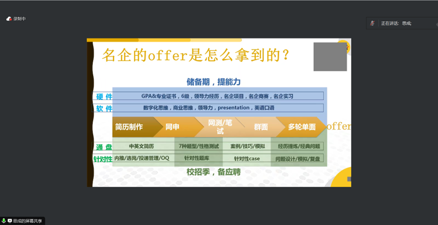 孔老师还从我院各专业就业出发详细介绍各专业的优质求职方向,并详细介绍了一线名企人才考核标准和通用的招聘流程,从软件+硬件+应聘技巧三个方面进行剖析和解读。