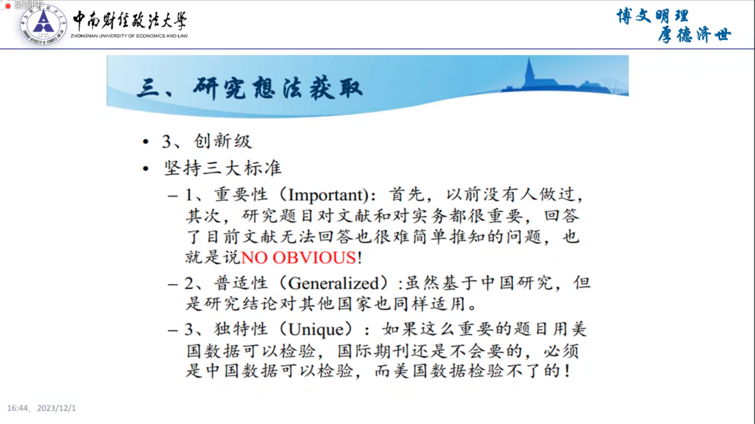 首先,李奥老师提出本次讲座的核心思想,即一篇好的研究需要重要而有趣的议题、高质量的数据、规范的实证和令人信服的结论。接着,基于核心思想,李奥老师介绍了做实证研究需要掌握的基础知识、数据库知识以及国内外学术期刊,对于研究想法的获取,李奥老师从基础级、改良级和创新级三个层级出发,向同学们阐述了相关做法与优缺点,若要达到创新级的目标,从案例到理论的分析方法则需要掌握。