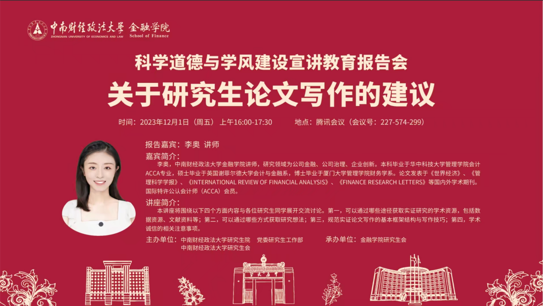 (通讯记者 范媛 俞沅沅)12月1日下午16:00,由我校研究生院、党委研究生工作部和校研究生会主办,金融学院研会承办的“科学道德与学风建设宣讲教育”报告会在腾讯会议成功举办。本期讲座分享的主题是“关于研究生论文写作的建议”,主讲人为米兰电竞·(中国区)金融学院李奥老师,学院师生共300余人参与此次讲座。