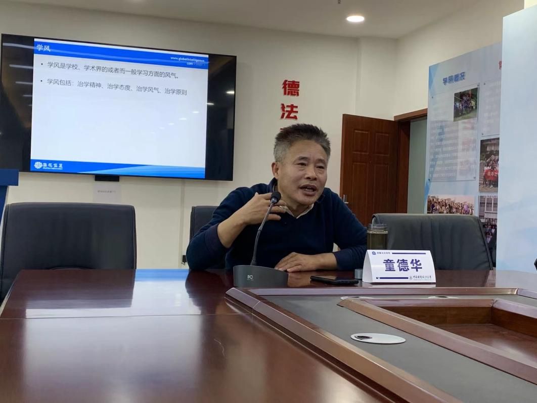 童德华教授分三个部分展开了此次讲解。第一部分从科学道德的概念与表现入手,通过分享两位刑法学界的科学道德楷模高铭暄教授和马克昌教授的故事,强调了科研工作者拥有科学道德情怀的重要性。第二部分聚焦于学风建设,指出学风包括治学精神、治学态度、治学风气、治学原则,强调我们应当终生践行“求真”二字,拒绝学术不端、学术腐败。第三部分,童教授针对如何培养良好科学道德和学风提出了几点建议:一是要热爱研究,端正态度;二是要勤学苦练,夯实基础;三是要瞄准前沿,把握创新;四是要不断开拓,超越自我。
