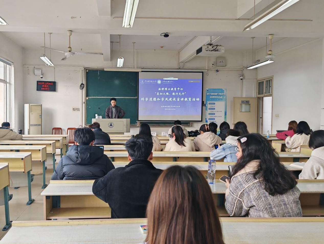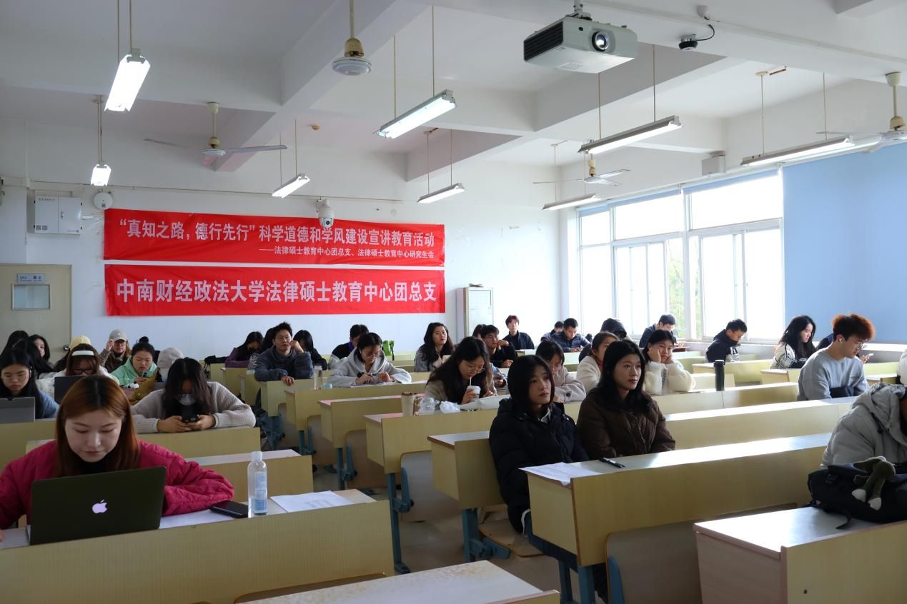 (通讯员 余安琪 李双娇 王济安 摄影 王嘉宁 李双娇)为深入学习贯彻习近平新时代中国特色社会主义思想和党的二十大精神,进一步深刻领会习近平总书记关于科学道德和学风建设的重要指示精神,由我校研究生院、党委研究生工作部和校研究生会主办,法律硕士教育中心承办的“科学道德和学风建设宣讲教育”系列活动于12月8日上午在文添楼202教室举办了“科学道德和学风建设宣讲教育”活动。本次活动旨在引导广大学生自觉遵守科学伦理,培养正确的学术态度和行为规范,促进全体师生共同营造诚信、创新、求真的良好学术环境。