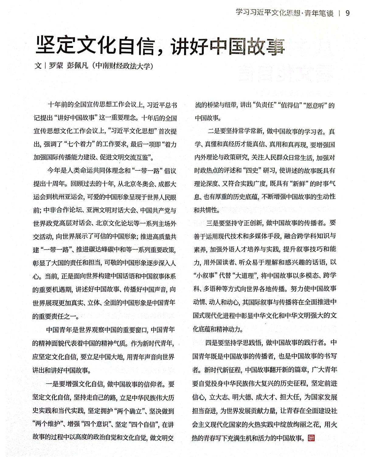 近日,学校研究生党员理论宣讲团成员2022级外国语学院硕士研究生罗蒙、2022级马克思主义学院硕士研究生彭佩凡共同撰写的学习习近平文化思想的青年笔谈《坚定文化自信,讲好中国故事》一文被《中国研究生》杂志2023年11期“学习习近平文化思想·青年笔谈”专栏刊载。