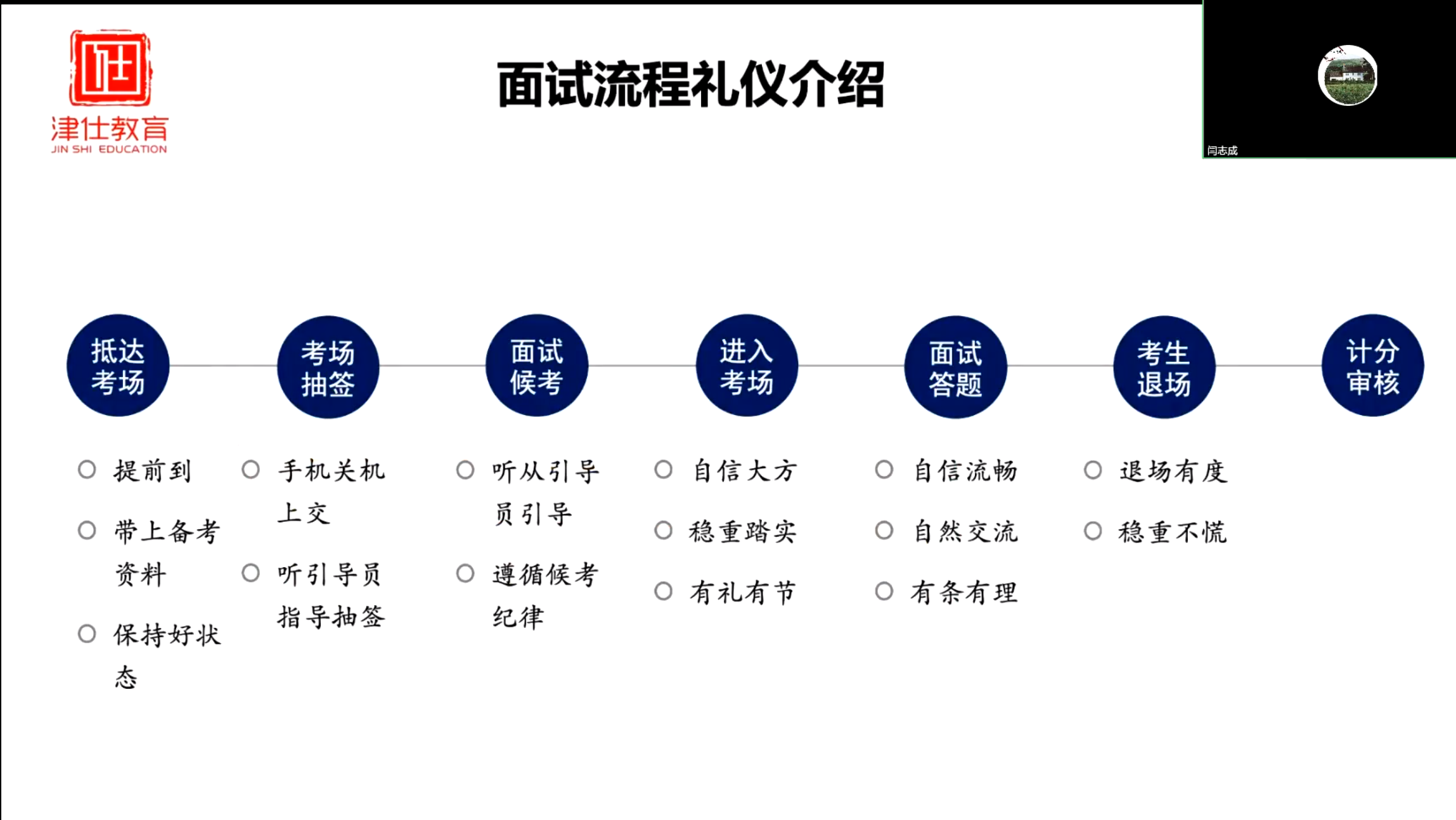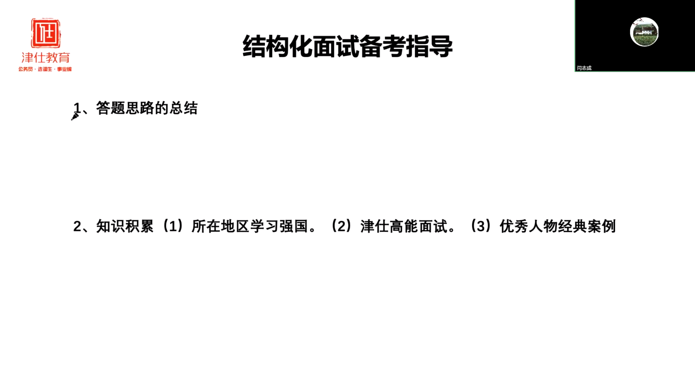 之后,闫志成讲师对备考结构化面试提出了指导。首先,他认为应当在做题的基础上,提炼适合自身的答题思路;其次,他认为可以通过所在地区的学习强国APP、津仕高能面试班、优秀任务经典案例学习,进行知识的积累。