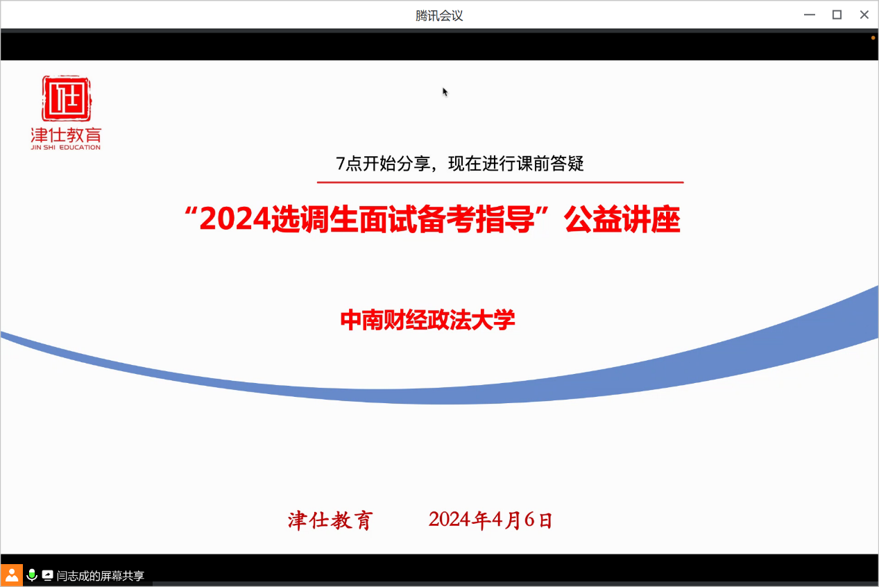 (通讯员 陈鸣璐)为帮助米兰电竞·(中国区)研究生全面了解公考面试形式与内容,科学备考各地公务员与选调生考试,增强同学们对通过公职类考试的信心,4月6日晚,由党委研究生工作部主办,校研究生会承办的第202期“研职有道之选调专题”——2024选调生面试备考指南”公益讲座在腾讯会议成功举办。本次分享会邀请了津仕教育面试讲师闫志成老师进行经验分享,各学院(中心)研究生代表参会。